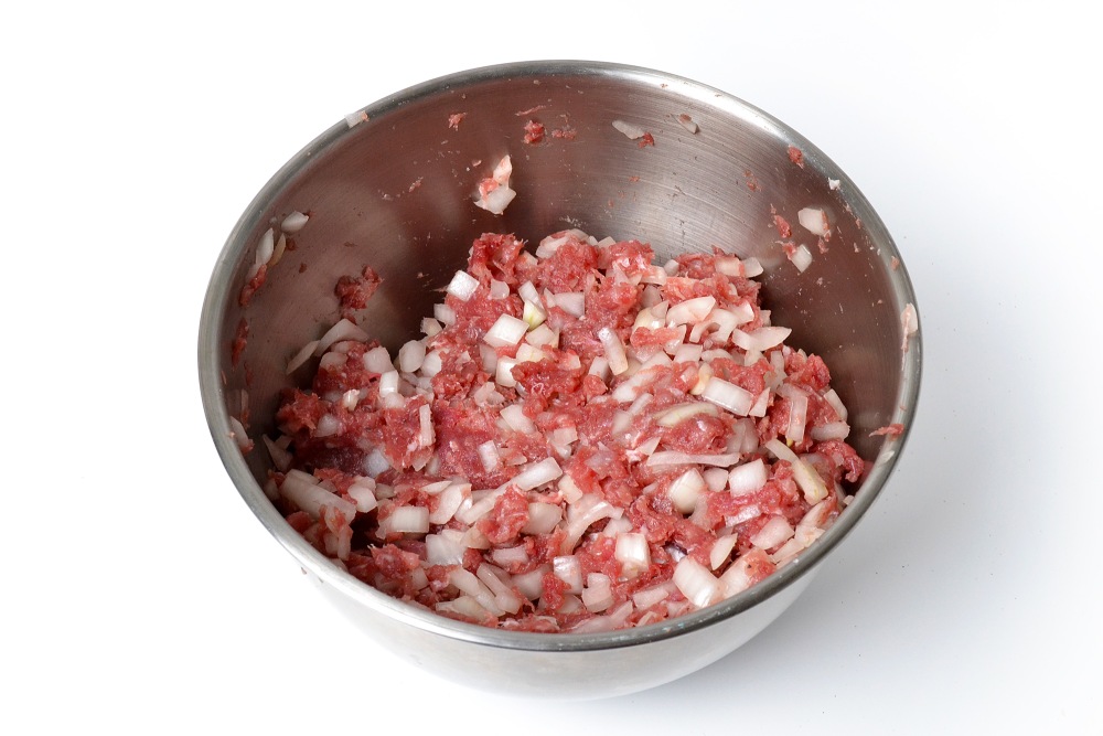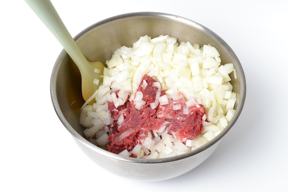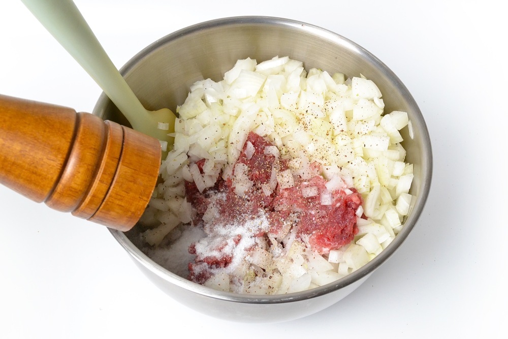 Тщательно перемешать фарш, чтобы лук и специи равномерно распределились по нему.