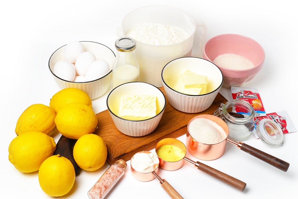 Подготовить ингредиенты: муку, сливочное масло, лимоны, яйца, сахар, дрожжи и молоко, соль, а также бобы тонка и цитронет при желании и белки для меренги.