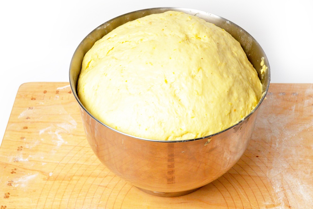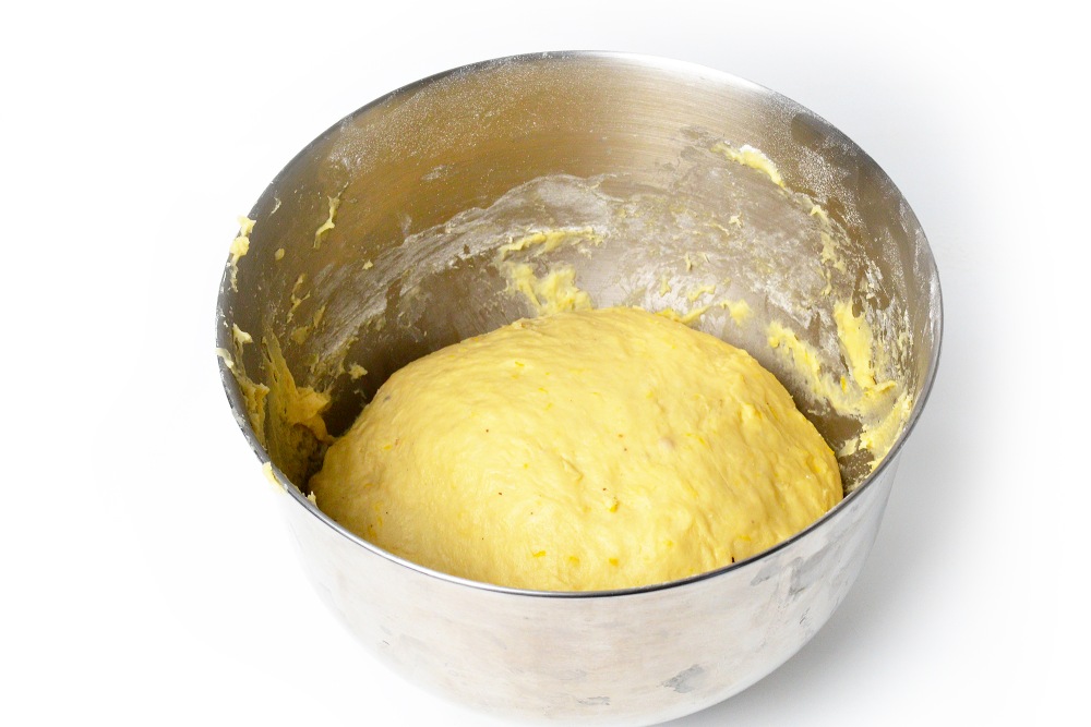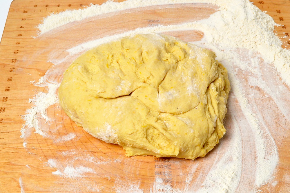 Когда тесто начнет хорошо отставать от стола, можно перестать добавлять муку. При этом важно, чтобы оно оставалось воздушным, не забитым. Однородным тесто с цедрой и лимонным соком не получится, как на другие куличи.
