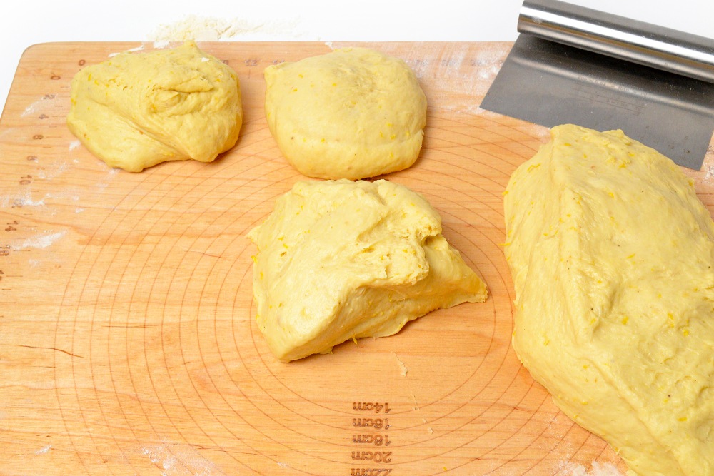 Совет: можно не разделять тесто сразу же, оставьте его в миске и просто отщипывайте по 320-350 г.