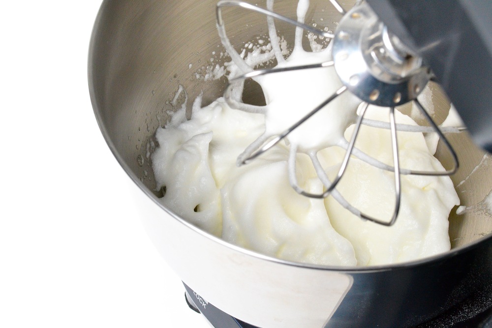 Пока сахар закипает, взбить белки. Они должны хорошо держать форму, быть на грани перебития: остаются в венчике, не растекаются.
