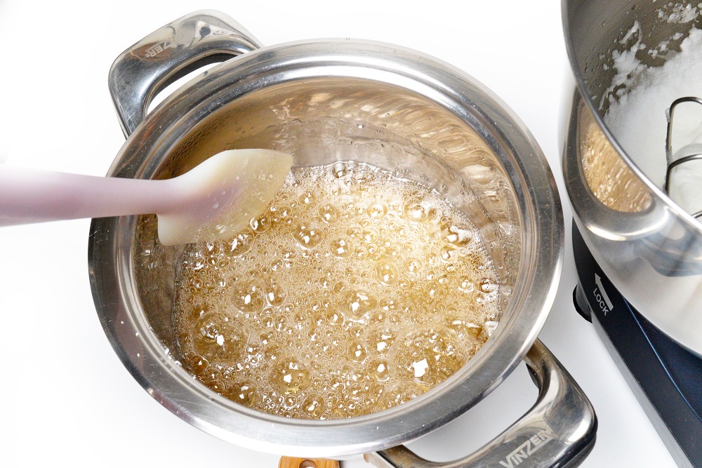 Когда сироп перестанет кипеть, влить его тонкой струйкой к белкам, включив невысокую скорость миксера. Затем включить максимальную мощность и взбивать меренгу 5-7 минут до готовности.