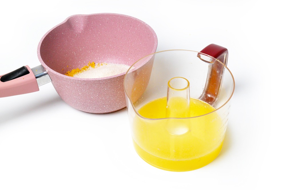 Выдавить из лимонов сок и добавить в сотейник. Туда же высыпать сахар, подготовленный для курда.