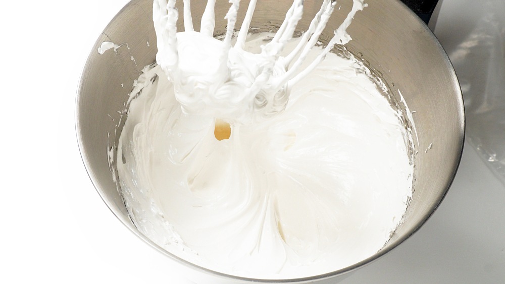 Включить миксер на среднюю скорость и постепенно влить горячий сироп. Затем включить максимальную скорость и взбивать меренгу 5-7 минут. Готовая меренга отстает от чаши, блестит, обладает очень мягкой, тянущейся, но не растекающейся консистенцией.
