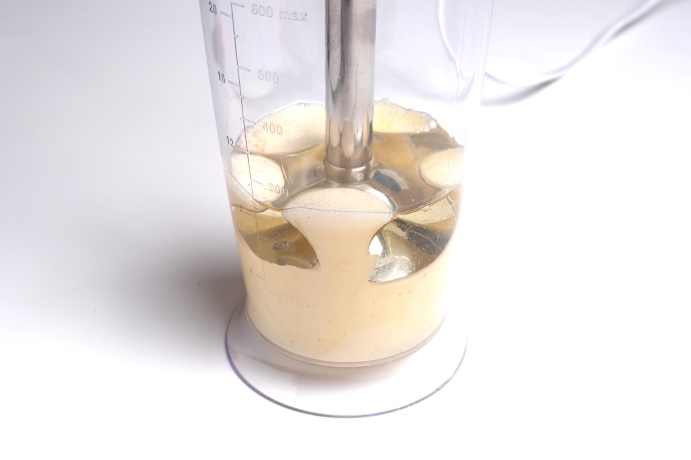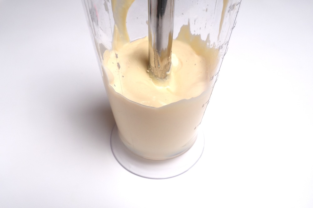 Блендер погрузить в чашу, поставить вплотную ко дну. Первую минуту взбивать, держа блендер крепко ко дну - так консистенция будет более однородной, майонез не будет содержать пузырьков воздуха. Далее, когда половина массы уже будет консистенции майонеза, взбивать движениями вверх-вниз, пока вся масса не станет однородной и гладкой. Всего по времени взбивание занимает 3-5 минут.