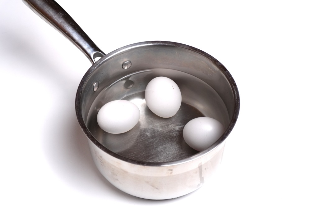 Далее вариант с вареными яйцами. Яйца можно отварить вкрутую, а можно просто пастеризовать - держать в горячей воде (60 градусов) 3-5 минут. Я выбираю яйца вкрутую. Их необходимо опустить в холодную воду, варить на среднем огне 7 минут. Затем переложить в ледяную воду - так легче очищать скорлупу, и яйца быстрее охладятся.
