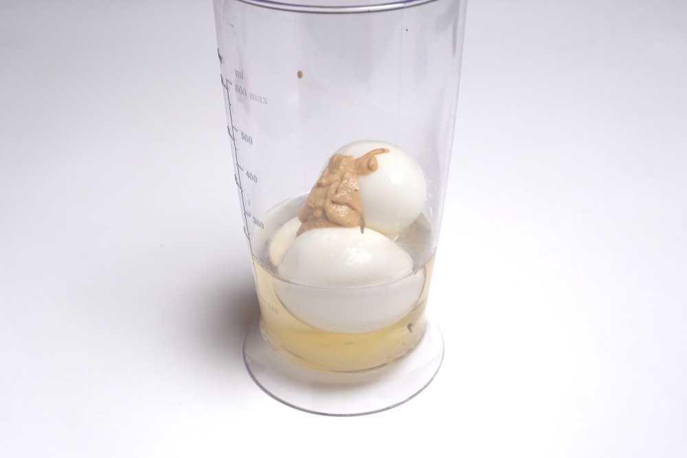 В сухой, чистой чаше блендера соединить вареные яйца, масло, горчицу, соль, сахар и лимонный сок.