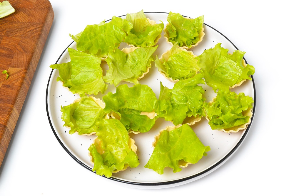 Листья салата помыть и тщательно обсушить от влаги, чтобы она не размочила тарталетки.