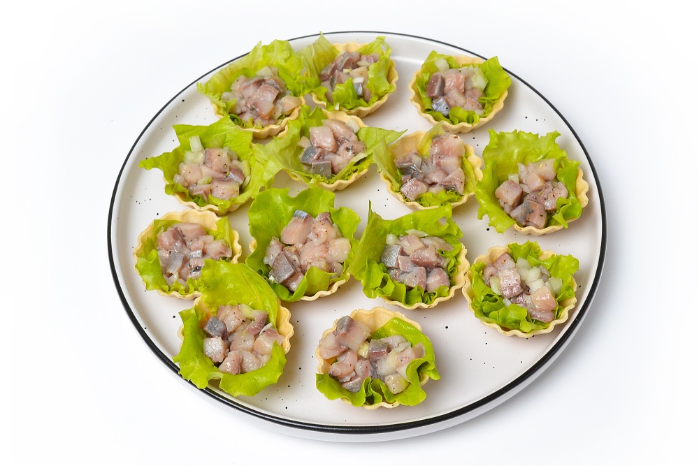 Вкус у такой селедки получается более нежный, деликатный. Как нельзя лучше для рецепта подходят песочные тарталетки – они дольше сохраняют форму и прекрасно сочетаются со вкусом салата. Но можно использовать и вафельные, если добавить к ним 1 важный компонент.