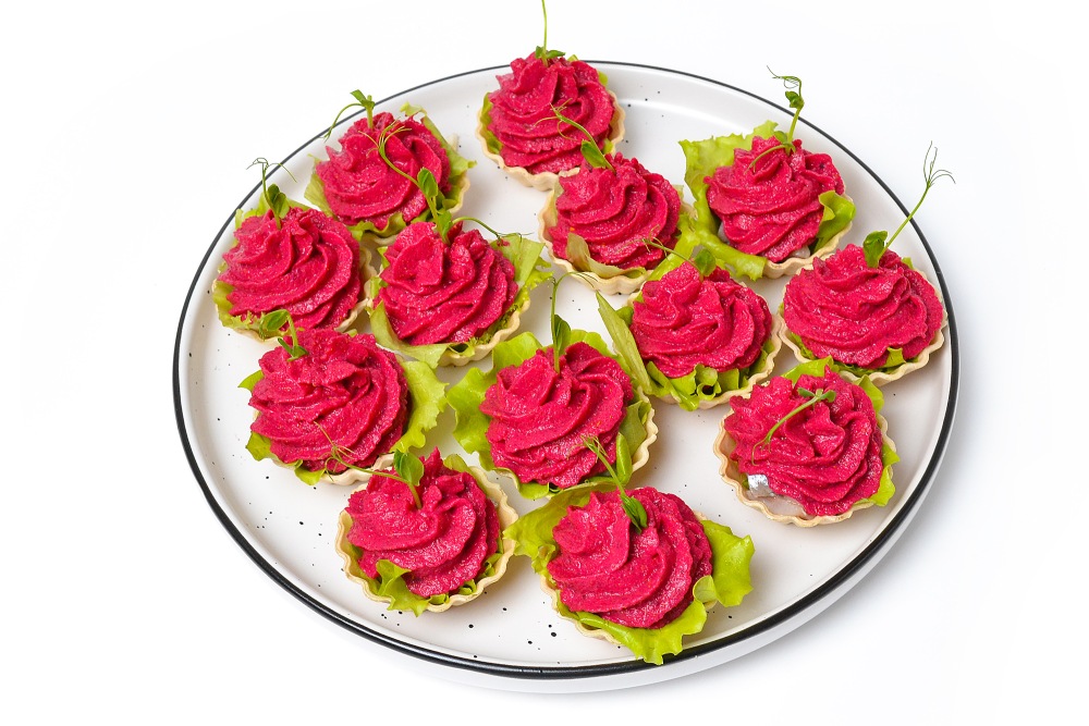 – При выкладывании салата в тарталетки следите, чтобы все участки были им закрыты, иначе они быстро размокнут от селедки и мусса.