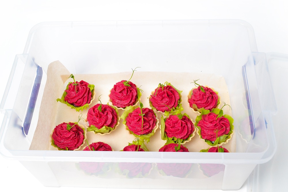 Способы хранения. Второй: сделать тарталетки с листьями салата и убрать в контейнер, проложенный пергаментом. Плотно закрыть и поставить в холодильник. Приготовить таким способом можно за сутки до праздника.