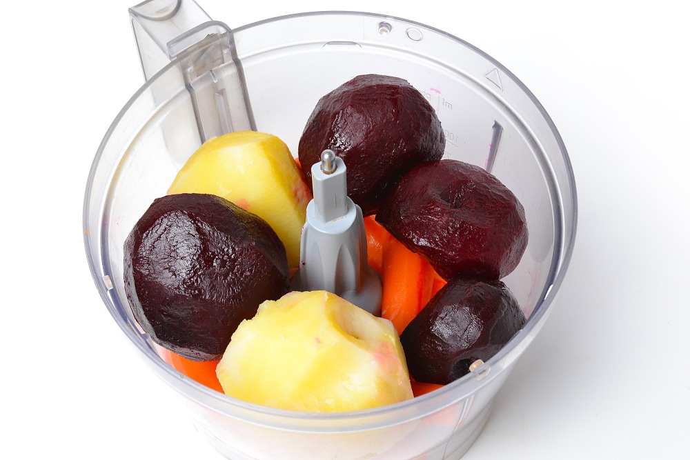 Овощи очистить от кожуры, если варили или запекали в ней, разрезать на 2-3 части и уложить в комбайн. Если не уверены, что техника справится с их измельчением в таком виде, нарежьте помельче.