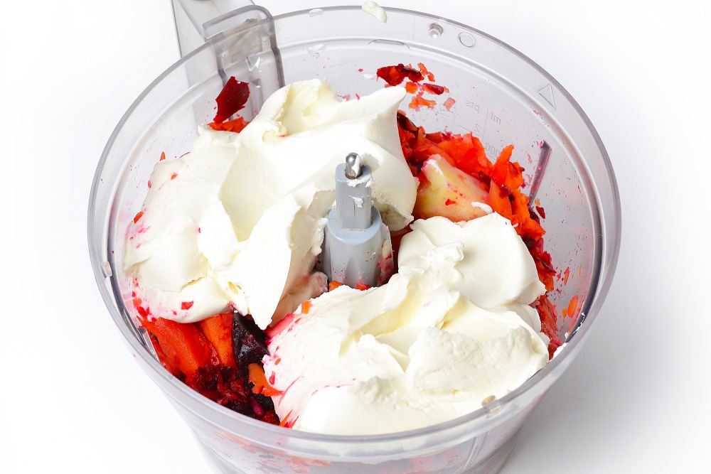 В этом рецепте нет яиц, но можно добавить 2-3 штуки вместо 100-150 г свеклы. В остальном пропорции лучше сильно не менять, чтобы мусс остался стабильным и не растекся. Именно поэтому вместо майонеза здесь используется творожный сыр.
