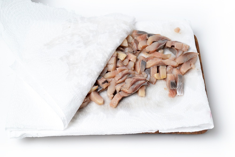 Селедку промокнуть полотенцами для удаления излишков масла и влаги.