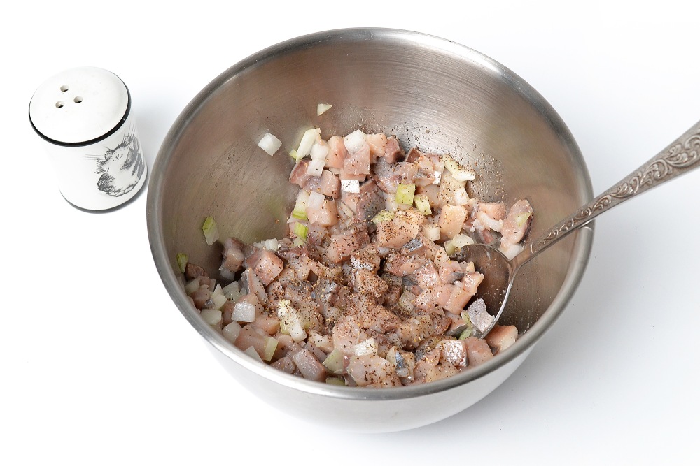 Смешать лук и рыбу, добавить черный перец по желанию.