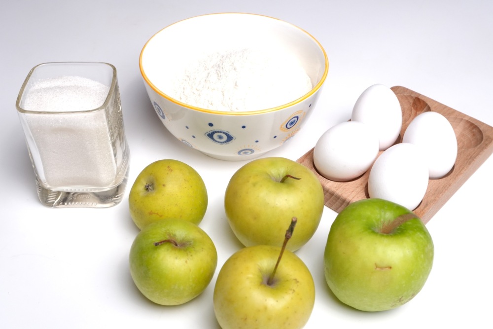 Подготовить все ингредиенты и посуду для приготовления простой шарлотки в аэрогриле. Яйца нужны комнатной температуры.