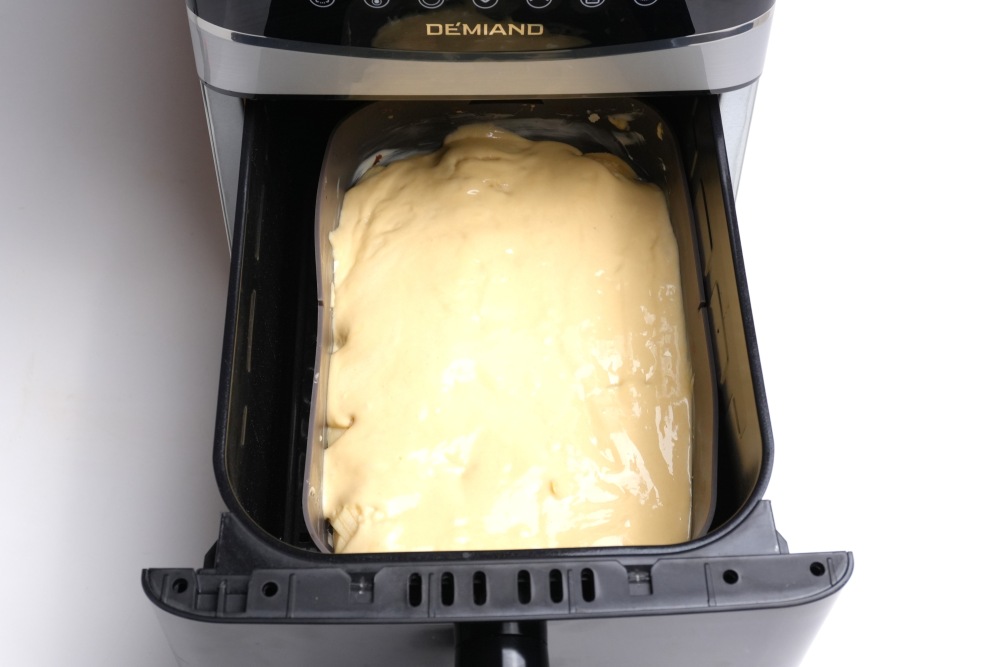Еще один плюс аэрогриля - его не нужно заранее прогревать, как духовку. Выложите форму на решетку или в чашу. Выпекайте при 170 градусах примерно 35-50 минут. Точное время трудно угадать, так мощность у аэрогрилей может быть разной. Первые 20 минут не открывайте чашу, иначе шарлотка осядет. После 30 минуты можно проверять готовность деревянной шпажкой - она должна выходить абсолютно сухой, без комков теста.