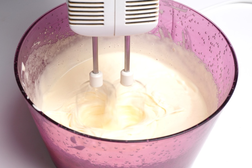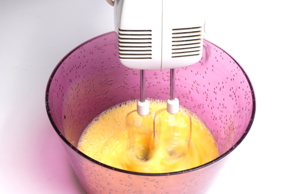 Яйца взбивать миксером на низкой скорости, постепенно увеличивая до максимальной, по времени около 4 минут.