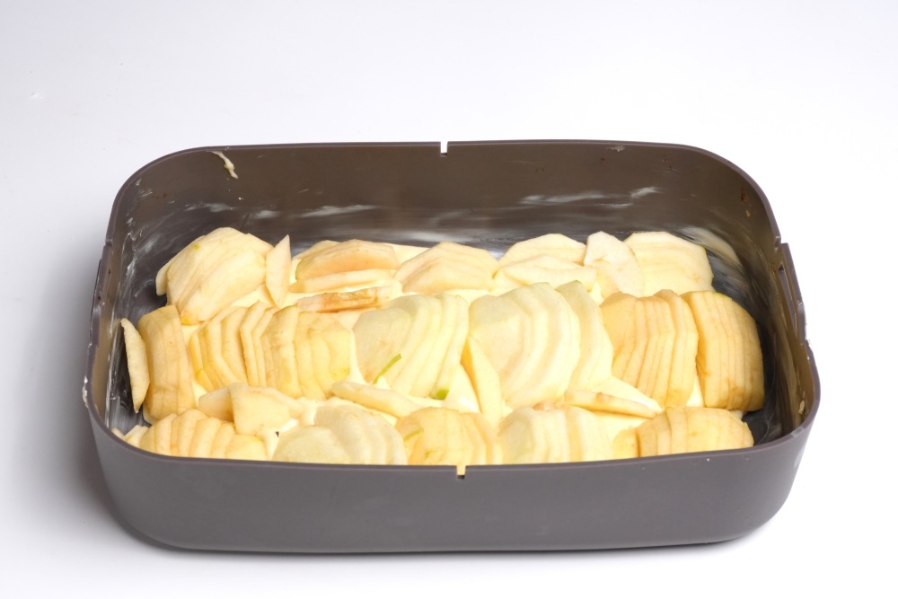 Залить яблоки тестом, распределить лопаткой, чтобы оно покрывало всю поверхность. Можно аккуратно постучать формой по столу, чтобы вышел воздух, и заполнились все пустоты.