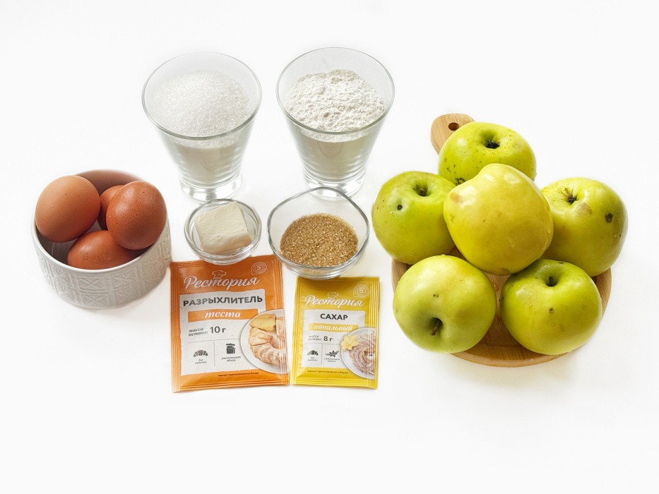 Подготовить продукты для приготовления пышной шарлотки с яблоками в мультиварке.