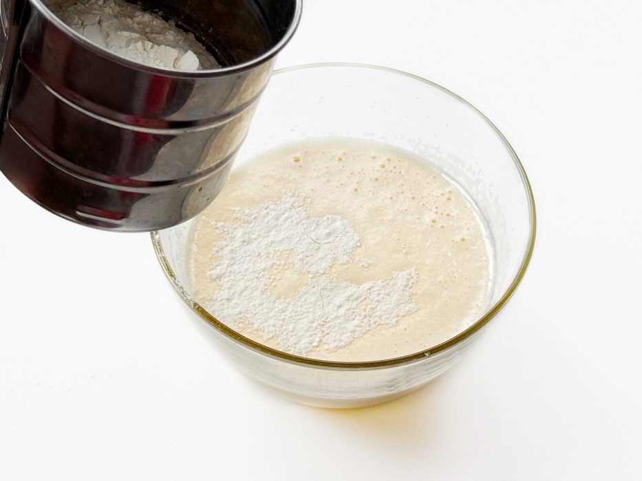 Просеять муку с разрыхлителем и аккуратно вмешать в яичную смесь лопаткой.