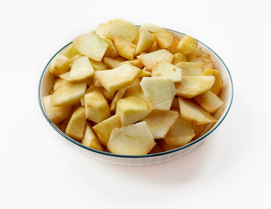 Подготовить яблоки, вымыть. Очистить яблоки от сердцевины и кожуры, нарезать большую часть яблок кубиками. При желании можно сбрызнуть лимонным соком, чтобы не чернели.