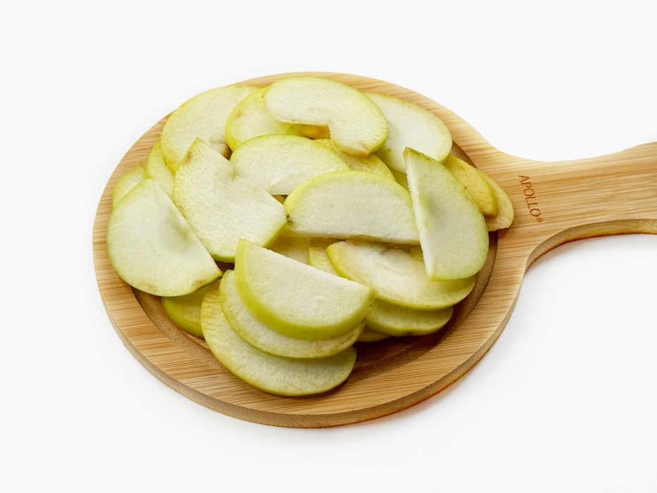 Выложить аккуратно яблоки, нарезанные дольками на дно чаши, как основу.