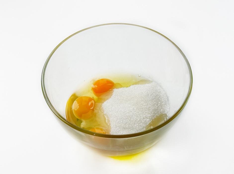 Яйца вбить в глубокую емкость, всыпать сахар, ванильный сахар.
