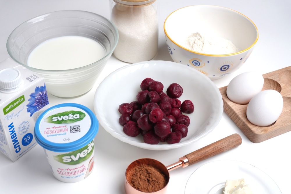 Подготовить ингредиенты для шоколадных блинов "Черный лес": яйца нужны комнатной температуры, а молоко горячее, но не кипящее. Творожный сыр и сливки нужны холодные. Замороженную вишню размораживать необязательно.
