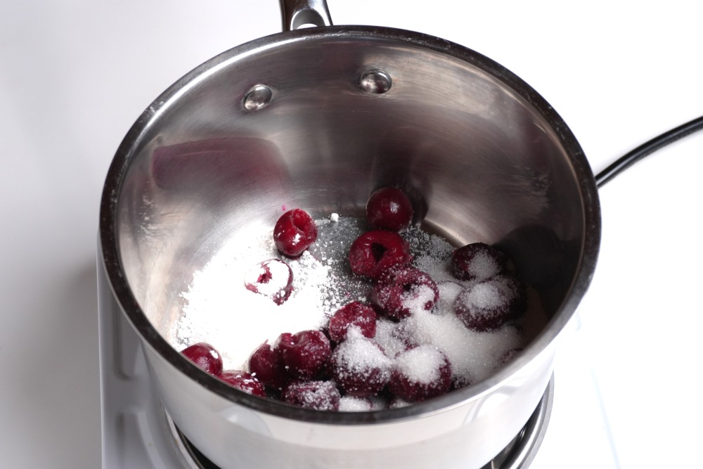 - Чтобы крахмал лучше растворился, его лучше развести вишневым соком и добавить к вишне.