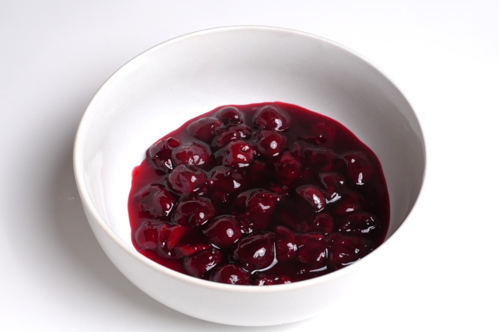 Вишню с густым соком переложить в миску, чтобы она полностью остыла. Сама вишня должна быть мягкой и полностью размороженной, а сок густым и тягучим.