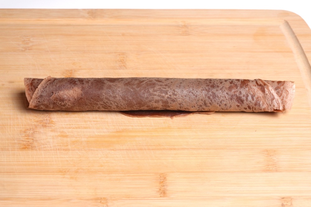 - Если один вариант подачи: положите на край блина ложку крема, сверху — ложку вишневого соуса, заверните конвертом или треугольником. Полейте растопленным шоколадом.