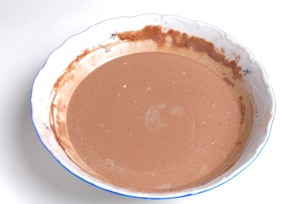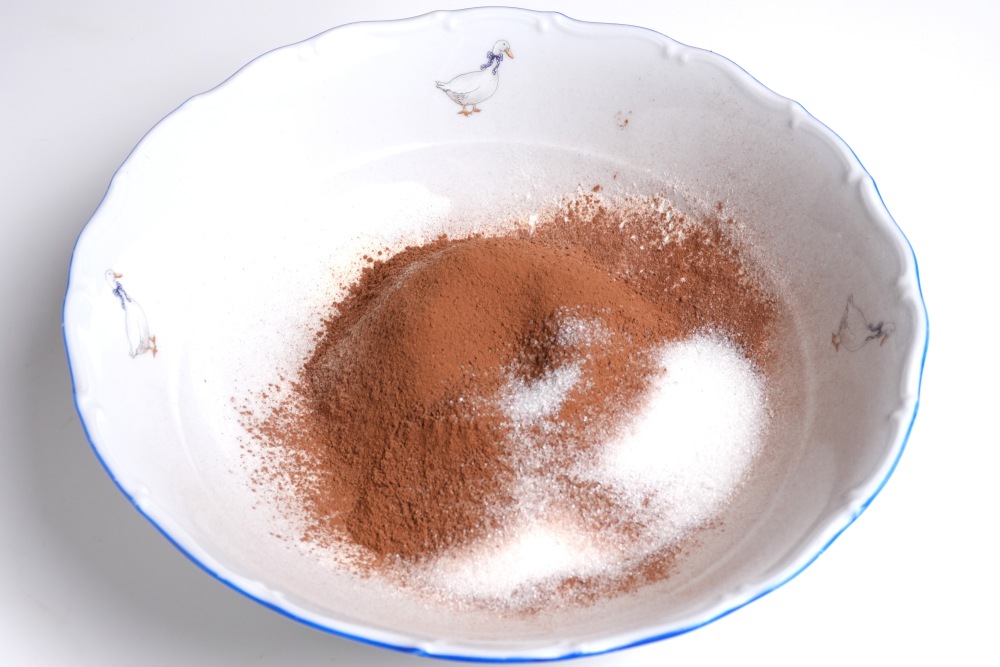 В глубокую миску просеять муку и какао, добавить сахар.