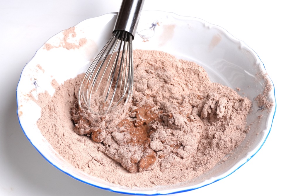 Венчиком перемешать сухие ингредиенты. Тоже важный этап при работе с мучными изделиями - так ингредиенты смешиваются равномерно, не будет случайных комочков какао или сахара.