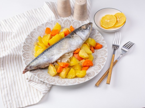 - Скумбрия- довольно жирная рыба и, например, салат из свежих овощей прекрасно все освежит.