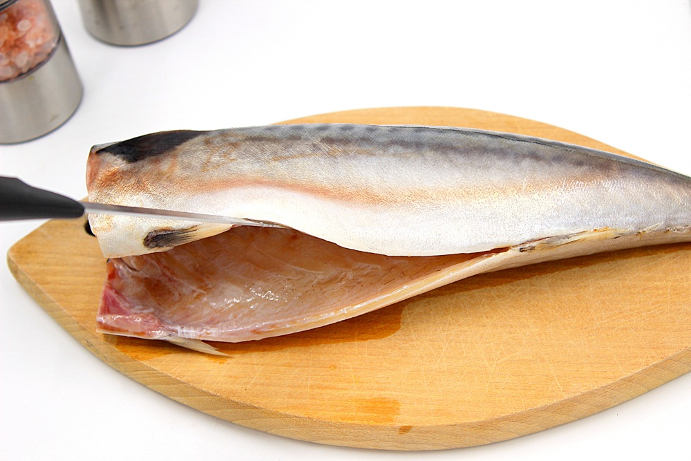 У скумбрии отрезать голову, хвост, выбрать внутренности, темную пленку и хорошенько промыть.