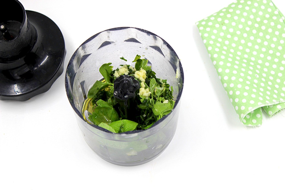 В блендер выложить зелень, пропущенный через пресс чеснок, грамм 30 оливкового масла и чайную ложку сока лимона.