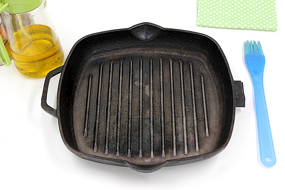 Смазать кисточкой сковороду-гриль, либо воспользоваться распылителем.