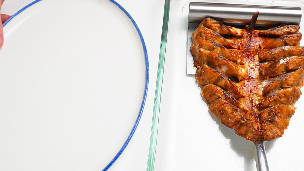 Дать рыбе остыть до умеренно горячего или теплого состояния. Затем, используя 2 широкие лопатки или кулинарный шпатель, перенести рыбу на сервировочное блюдо.