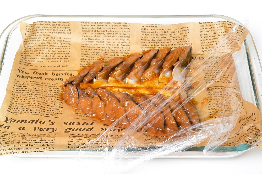 После нанесения маринада тщательно закрыть пленкой. Убрать в холодильник в самую холодную зону, но не в морозилку.