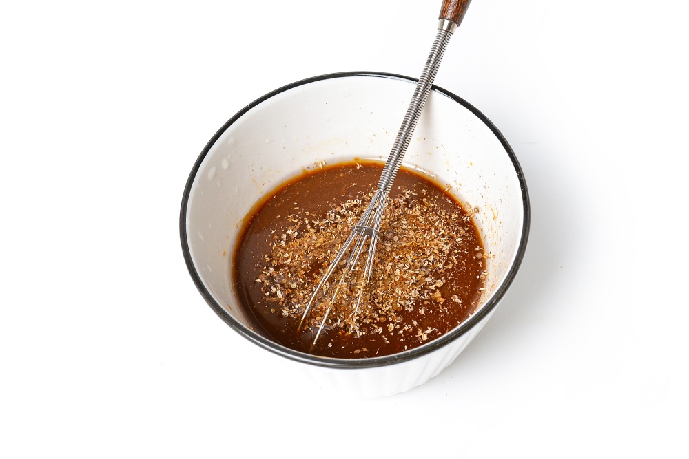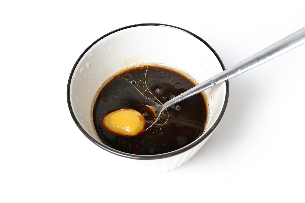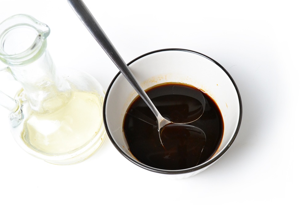 В миске соединить соевый соус, терияки и добавить растительное масло.