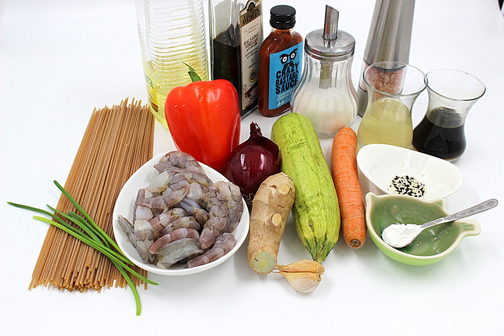 Подготовить все ингредиенты для собы с креветками и овощами в соевом соусе.