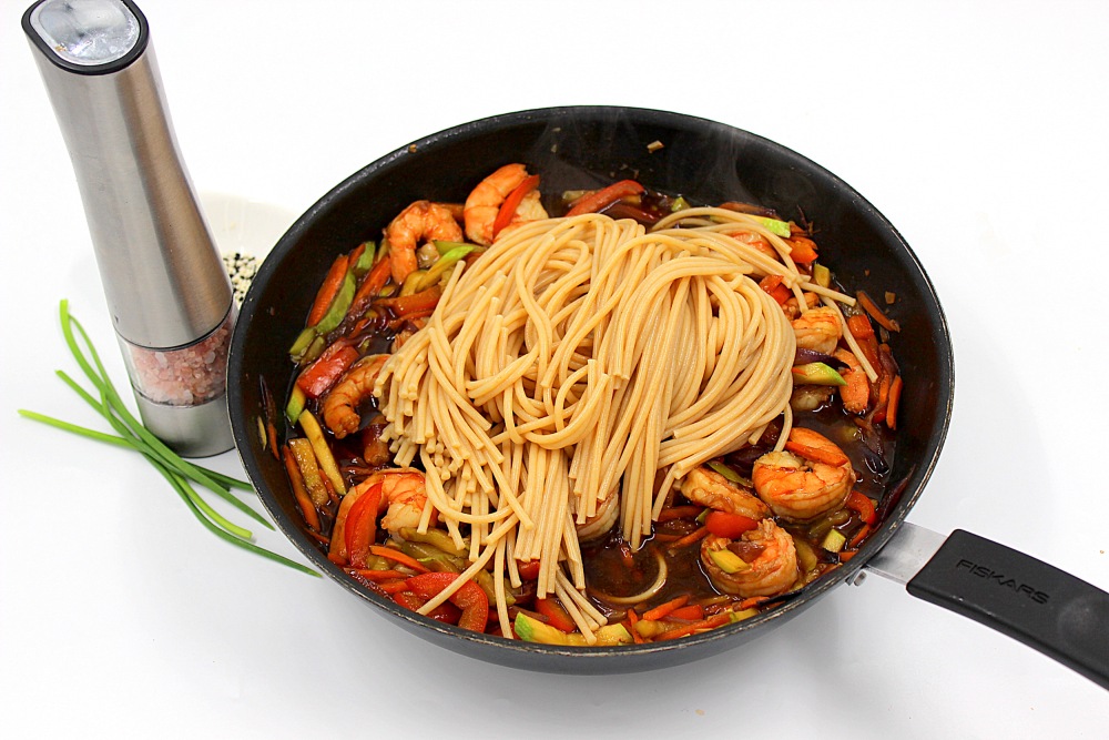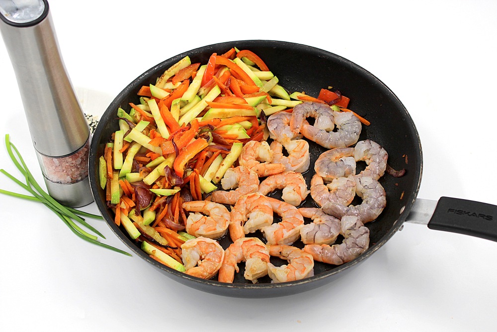 Овощи отодвинуть на край и добавить на сковороду креветки. Обжаривать минуту, с двух сторон, до красивого, розового цвета. Не больше.