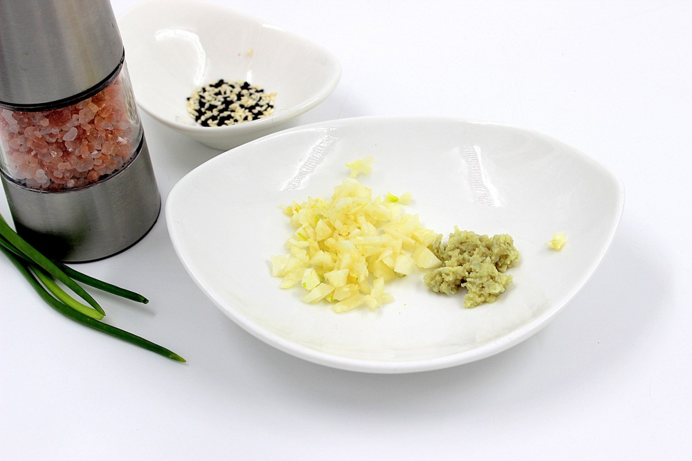 На мелкой тёрке натереть чайную ложку имбиря, а чеснок измельчить.