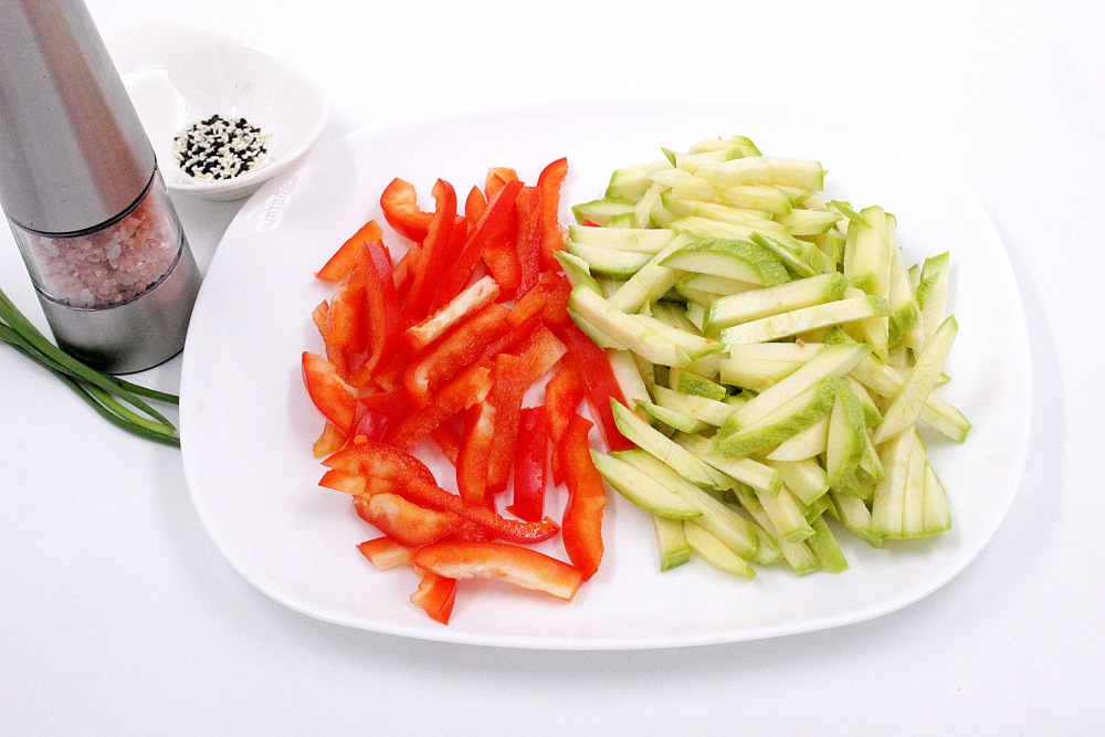 Нашинковать небольшой соломкой кабачок и болгарский перец.