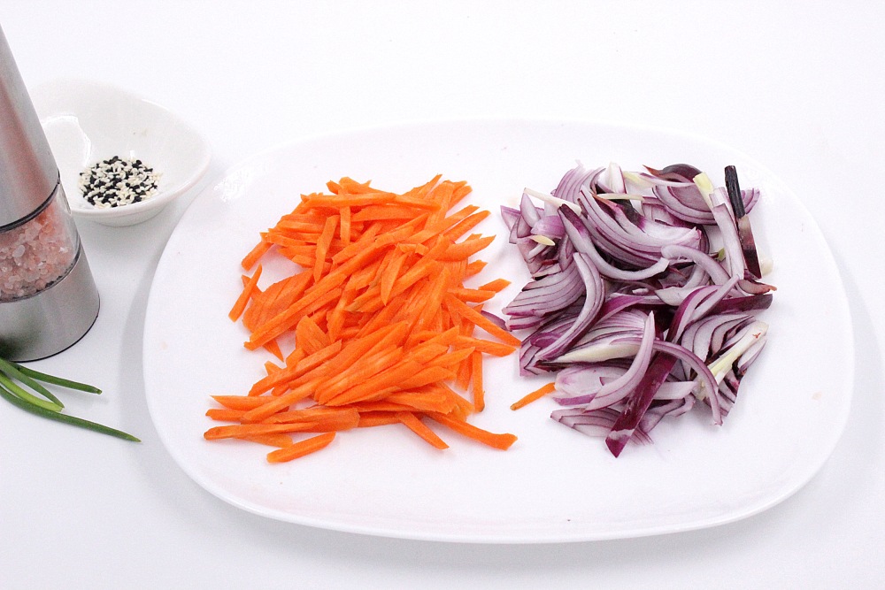 Красный лук нарезать перьями, а морковь тонкой соломкой.