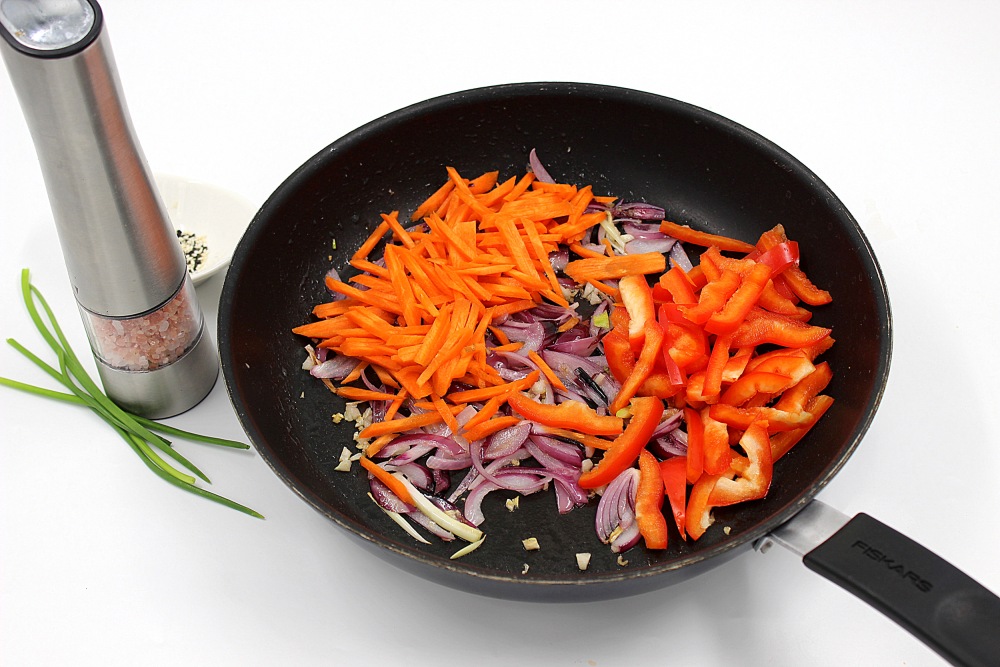 Добавить морковь, перец и обжаривать помешивая еще минуты 3.