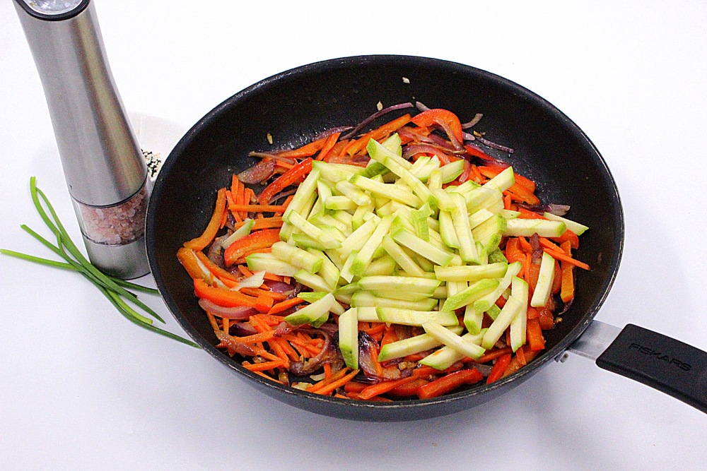 Далее закинуть кабачок и продолжить обжарку ещё на пару минут.