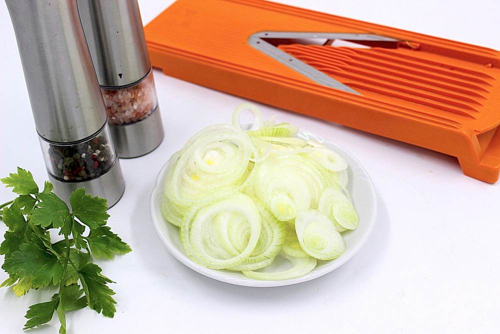 Лук нарезать тонкими кольцами или перьями.
