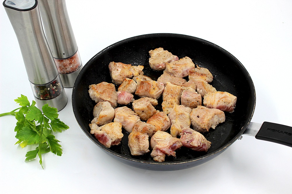 Разогреть топленое масло на сковороде и жарить со всех сторон свинину, минут 5. Выбрать мясо на тарелку.